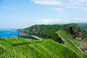 샤코탄(Shakotan)반도에있는카무이곶(Kaamui Cape)은360도의일본해해협풍경을제공합니다. 산책로를걸어서하루를보내고끝이없는거친언덕사진을찍으십시오. 레드플래닛삿포로남수수키노에서차또는버스로2 시간이내에거리입니다.